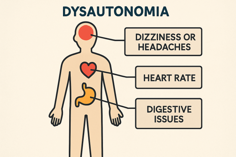 Dysautonomia refers to a group of conditions that disrupt the autonomic nervous system (ANS), affecting involuntary bodily functions such as heart rate, blood pressure, digestion, and temperature regulation. Symptoms are variable and can significantly affect daily life, complicating diagnosis due to overlap with other chronic conditions. Common symptoms include dizziness, chronic fatigue, irregular heartbeats, digestive issues, temperature regulation problems, headaches, and sleep disturbances. Effective management often requires specialized care, as patients can remain undiagnosed for years, hindering treatment implementation.
