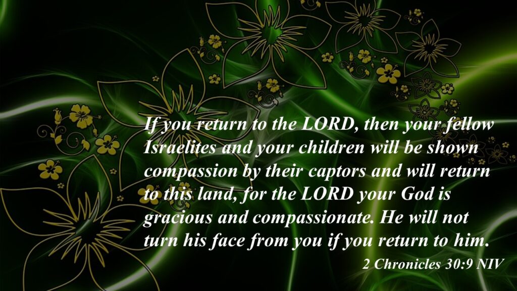 “For if you return to the LORD, your relatives and your children will be treated mercifully by their captors, and they will be able to return to this land. For the LORD your God is gracious and merciful. If you return to Him, He will not continue to turn His face from you.” 2 Chronicles 30:9 NLT
